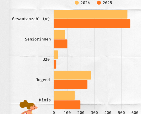 Jugendbereich mit 249 Spielerinnen noch eine solide Basis haben, wird die Situation um die U20 kritisch. Hier ist die Zahl von 31 auf nur noch 19 Spielerinnen gesunken. Das entspricht einem Verlust von fast vierzig Prozent innerhalb eines Jahres.