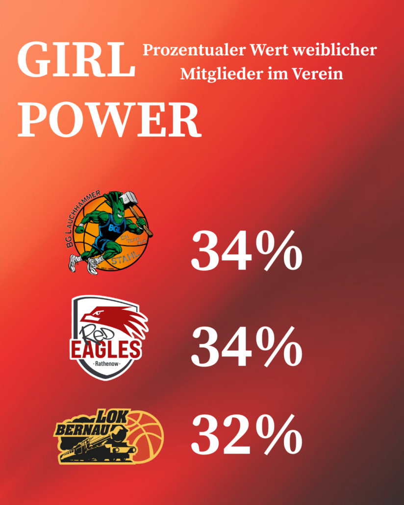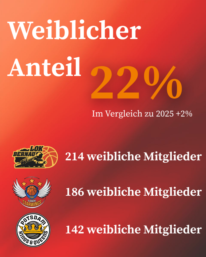 Der Anteil weiblicher Mitglieder liegt aktuell bei 22 %. Die gezielte Förderung des Mädchen- und Frauenbasketballs bleibt weiterhin ein wichtiger Schwerpunkt der Verbandsarbeit.