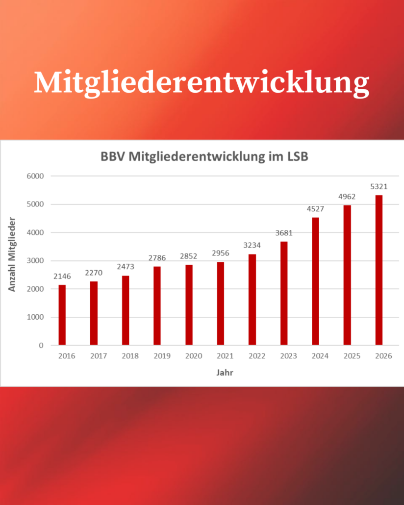 Der Brandenburgische Basketball-Verband (BBV) zählt zum Stichtag 01.01.2026 insgesamt 5.321 Mitglieder. Im Vergleich zum Vorjahr (4.962 Mitglieder) entspricht das einem Wachstum von +7,23 %. Damit setzt sich der positive Trend der vergangenen Jahre fort – auch wenn sich die Dynamik nach den außergewöhnlich starken Zuwächsen der Vorjahre erwartungsgemäß etwas abgeschwächt hat.